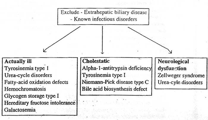 Specific metabolic diseases such as lactosemia or tyrosinemia type I. It is casual to perform a series of first line tests in order to exclude the known causes of intraurine infection and certain inborn errors of metabolism and to establish the patency of ktraheptic biliary tree (figure 1). More specialized tests are only performed if clinical suspicion is high or the first line tests suggest an inborn error of metabolism (table 2).